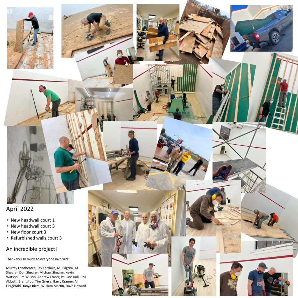 A great team of volunteers replaced court 1 and 3 front walls and replaced court 3 floor. All 3 courts feature sprung flooring and new front walls (no more home court bounces 🙂 )